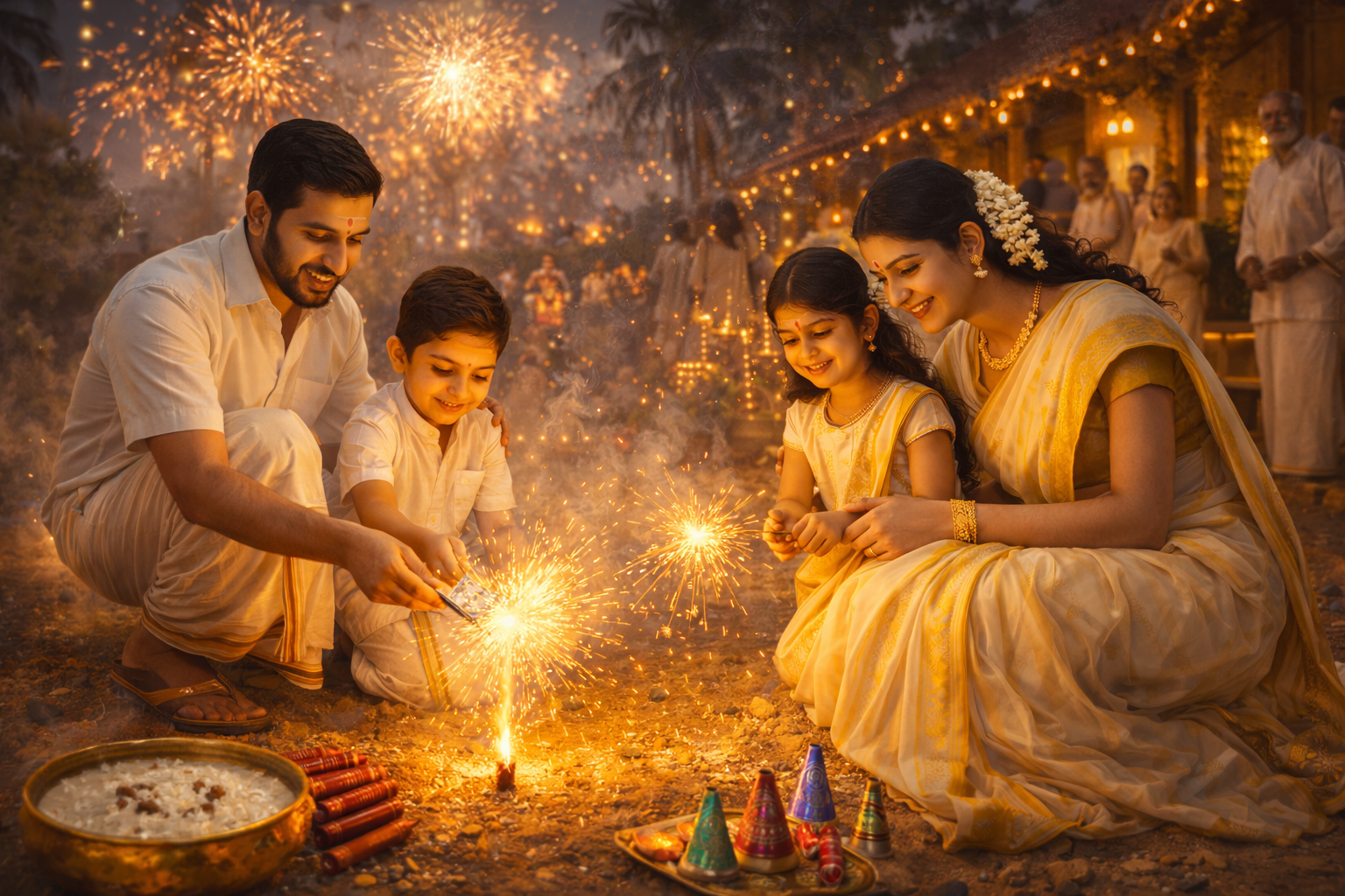 Vishu Padakkam refers to the bursting of firecrackers, a fun and exciting tradition after breakfast on Vishu. Youngsters step out of their homes to light crackers, and even the elders join in the celebration, making it a lively and festive activity enjoyed by all.
