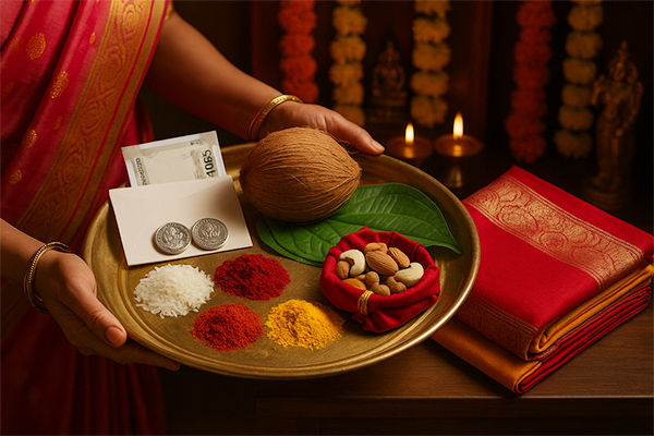 - Coconuts, betel leaves, or dry fruits wrapped in red or yellow cloth