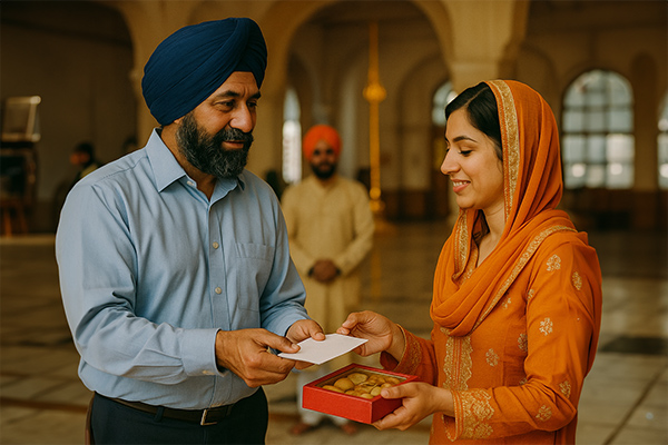 In Sikhism, Shagun is commonly offered during Anand Karaj (weddings), Naam Karan (naming ceremonies), and Gurpurabs (birth anniversaries of Gurus). It is usually given in an envelope with cash, accompanied by sweets or dry fruits. The gesture reflects respect, blessings, and a spirit of Seva (selfless giving).