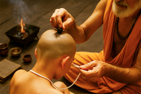 Additionally, the Shikha is ritually tied during important Samskaras (Hindu rites of passage). Most notably during the Upanayana Sanskar. This ceremony marks the beginning of a child’s formal spiritual journey, where the sacred thread (yajnopavita) is bestowed, and the Shikha is established as a lifelong symbol of spiritual pursuit.