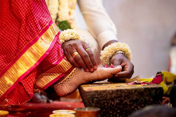 Tamil Nadu: The ritual of placing the bride's foot on a grinding stone (ammi) symbolizes strength and stability in marriage. Following this, the groom adorns her feet with silver toe rings, emphasizing his commitment and respect.