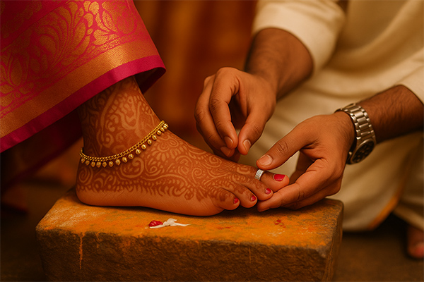 Telugu Traditions: In Telugu weddings, the Sthālīpākaṃ ritual involves the groom adorning the bride's feet with silver mettelu (toe rings), signifying her new status as a married woman.