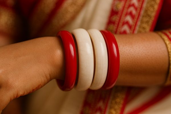 In Bengali culture, married women wear Shankha (white conch shell bangles) and Pola (red coral bangles). These bangles are given during wedding rituals and signify marital bliss, protection, and prosperity. Wearing these sacred bangles is a daily reminder of the blessings associated with married life.