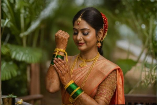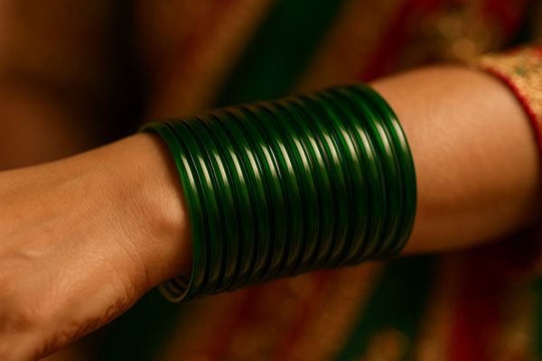 In Maharashtra, green glass bangles are traditionally worn by brides and married women during weddings and religious festivals like Mangalagaur . Green represents fertility, growth, and harmony. Wearing green bangles is believed to attract good health and positivity into family life.