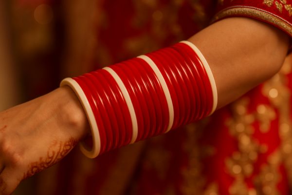 In Punjabi weddings, the Chooda ceremony is a central ritual where the bride wears a set of ivory or plastic bangles in red and white colours. The Chooda symbolizes prosperity, happiness, and a long married life. Traditionally, brides would wear their chooda for up to a year after marriage to protect their new journey with divine blessings.
