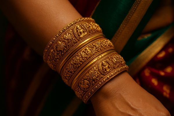 In South India, particularly in Tamil Nadu, Kerala, Karnataka, and Andhra Pradesh, gold bangles are considered a vital part of a woman’s jewellery collection. Brides are adorned with thick gold bangles, often intricately designed with motifs of gods, flowers, and nature.