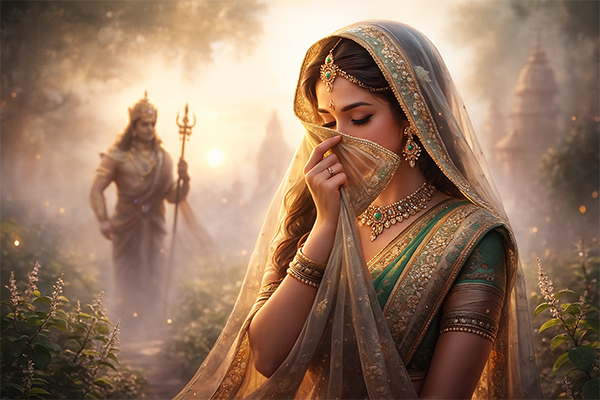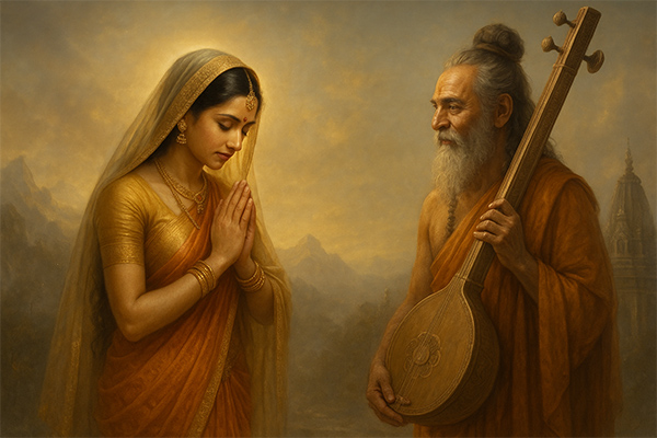 The Padma Purana narrates an incident where Goddess Parvati, upon seeing Sage Narada, greets him with joined hands and lowers her gaze. This act of veiling herself in humility reflects the deep cultural values of respect and sanctity in the presence of the wise and divine.