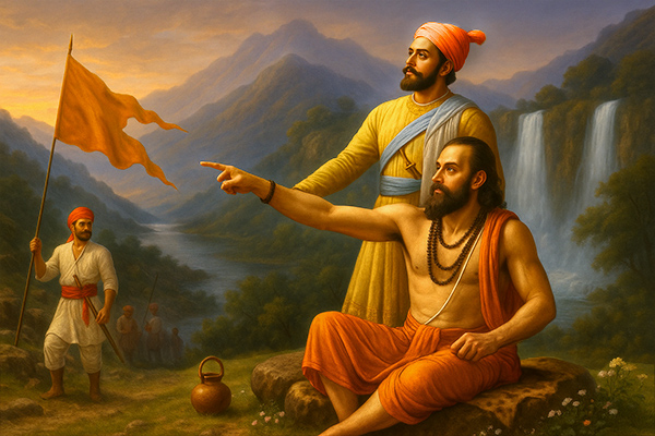 That saffron flag became the spiritual emblem of Shivaji’s Swarajya. A kingdom rooted in justice, spiritual values, and protection of the righteous. It signalled that both the saint and the ruler stood for the same truth; one through silence, the other through action.