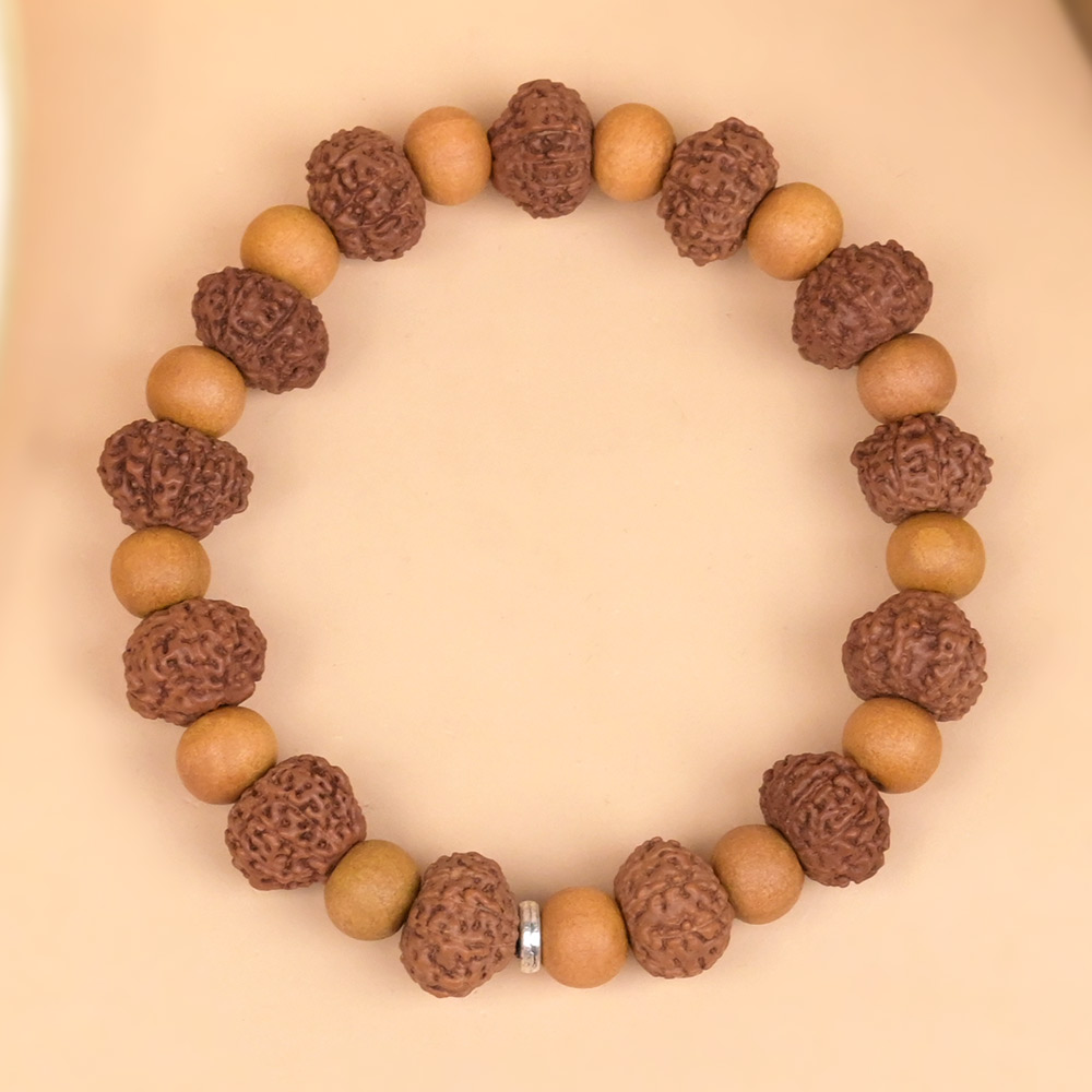 This sacred bracelet is crafted with authentic Ten Mukhi Rudraksha beads paired with smooth White Sandalwood beads, forming a calm and balanced design. The elements are securely assembled, offering comfort and durability for regular spiritual wear.