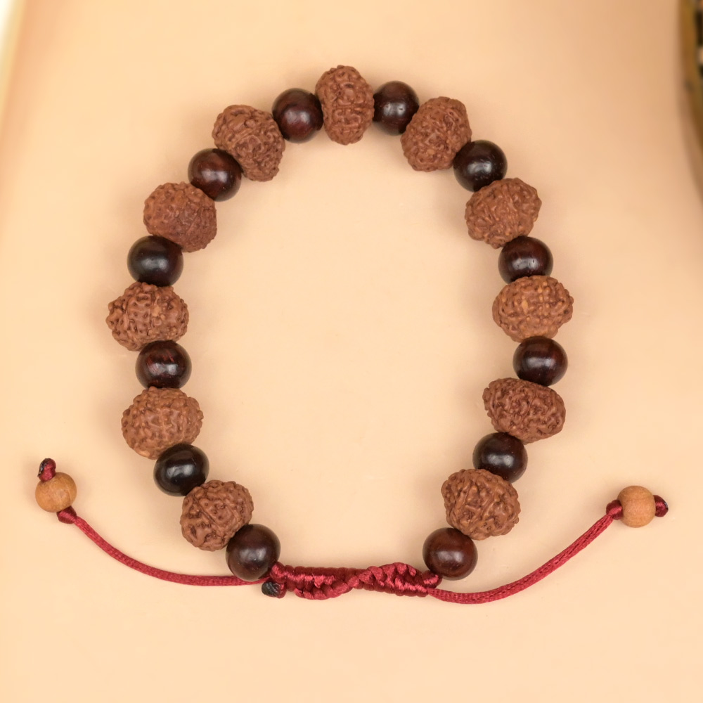 This sacred adjustable bracelet is crafted with authentic Ten Mukhi Rudraksha beads paired with smooth Red Sandalwood beads, forming a grounded and balanced design. The adjustable closure ensures a comfortable fit, while secure assembly supports regular spiritual wear.