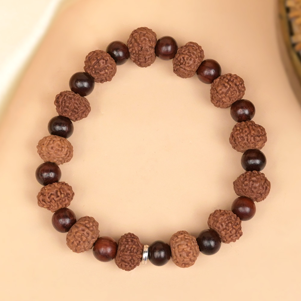 This sacred bracelet is crafted with authentic Ten Mukhi Rudraksha beads paired with smooth Red Sandalwood beads, forming a grounded and balanced design. The elements are securely assembled, offering comfort and durability for regular spiritual wear.