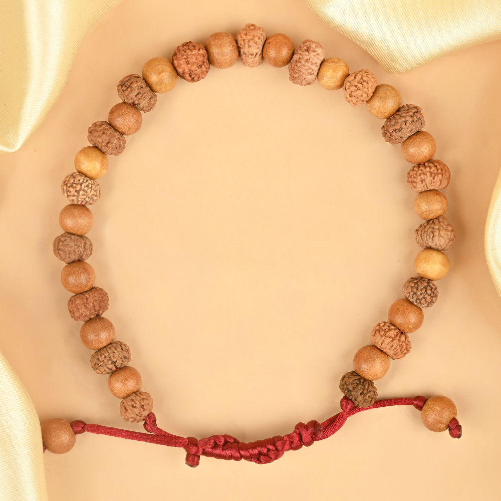 The 11 Mukhi Rudraksha activates the Manipura (Solar Plexus) Chakra, strengthening willpower, leadership, and confidence, while White Sandalwood calms the mind and promotes emotional harmony and clarity. The adjustable design ensures a comfortable fit, allowing continuous alignment with its spiritual and protective energies.