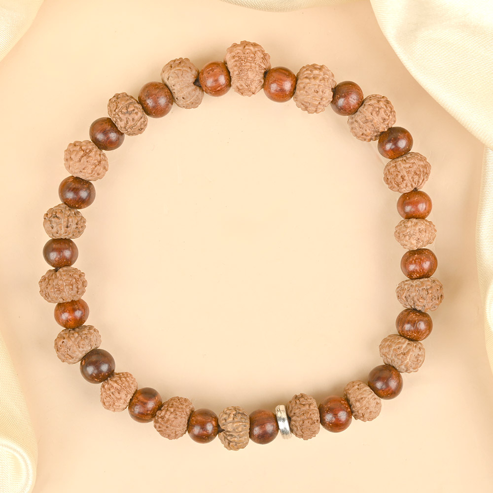 The 11 Mukhi Rudraksha activates the Manipura (Solar Plexus) Chakra, strengthening willpower, leadership, and self-confidence, while Red Sandalwood promotes emotional stability, resilience, and grounding. Together, they foster inner strength, clarity, and spiritual growth, making this bracelet ideal for those seeking success, protection, and divine blessings in all aspects of life.