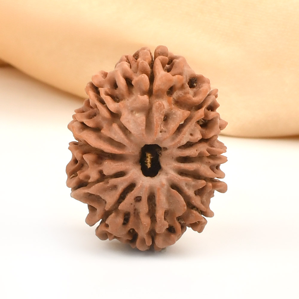 The 12 Mukhi Rudraksha embodies the energy of the Surya Deva and empowers the wearer with qualities of the Sun like authority, brilliance, and influence. It provides relief from stress and anger rooted in feelings of victimization, worries, suspicion, fear of the future, dependency, and low self-respect. The wearer gains personal power, drive, vigor, excellent health, and a commanding presence. This Rudraksha fosters leadership qualities, visionary abilities, and the motivation to take decisive action leading in achievements that bring name, fame, success, and recognition. Additionally, it supports overall health and aids in better digestion.