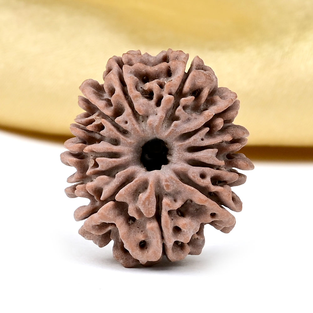 The 12 Mukhi Rudraksha embodies the energy of the Surya Deva and empowers the wearer with qualities of the Sun like authority, brilliance, and influence. It provides relief from stress and anger rooted in feelings of victimization, worries, suspicion, fear of the future, dependency, and low self-respect. The wearer gains personal power, drive, vigor, excellent health, and a commanding presence. This Rudraksha fosters leadership qualities, visionary abilities, and the motivation to take decisive action leading in achievements that bring name, fame, success, and recognition. Additionally, it supports overall health and aids in better digestion.