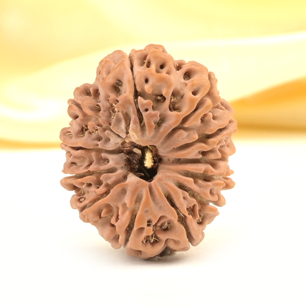 The 12 Mukhi Rudraksha embodies the energy of the Surya Deva and empowers the wearer with qualities of the Sun like authority, brilliance, and influence. It provides relief from stress and anger rooted in feelings of victimization, worries, suspicion, fear of the future, dependency, and low self-respect. The wearer gains personal power, drive, vigor, excellent health, and a commanding presence. This Rudraksha fosters leadership qualities, visionary abilities, and the motivation to take decisive action leading in achievements that bring name, fame, success, and recognition. Additionally, it supports overall health and aids in better digestion.