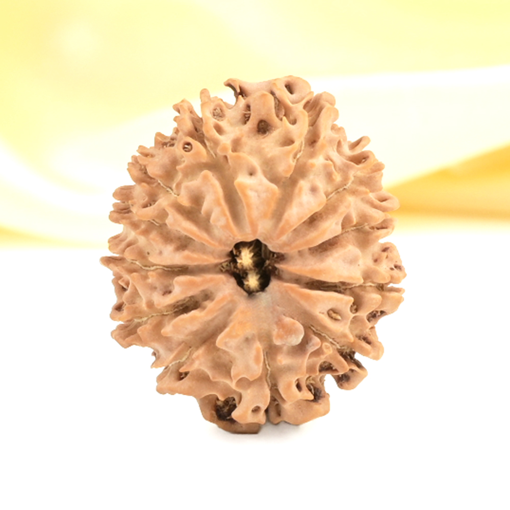The 12 Mukhi Rudraksha embodies the energy of the Surya Deva and empowers the wearer with qualities of the Sun like authority, brilliance, and influence. It provides relief from stress and anger rooted in feelings of victimization, worries, suspicion, fear of the future, dependency, and low self-respect. The wearer gains personal power, drive, vigor, excellent health, and a commanding presence. This Rudraksha fosters leadership qualities, visionary abilities, and the motivation to take decisive action leading in achievements that bring name, fame, success, and recognition. Additionally, it supports overall health and aids in better digestion.