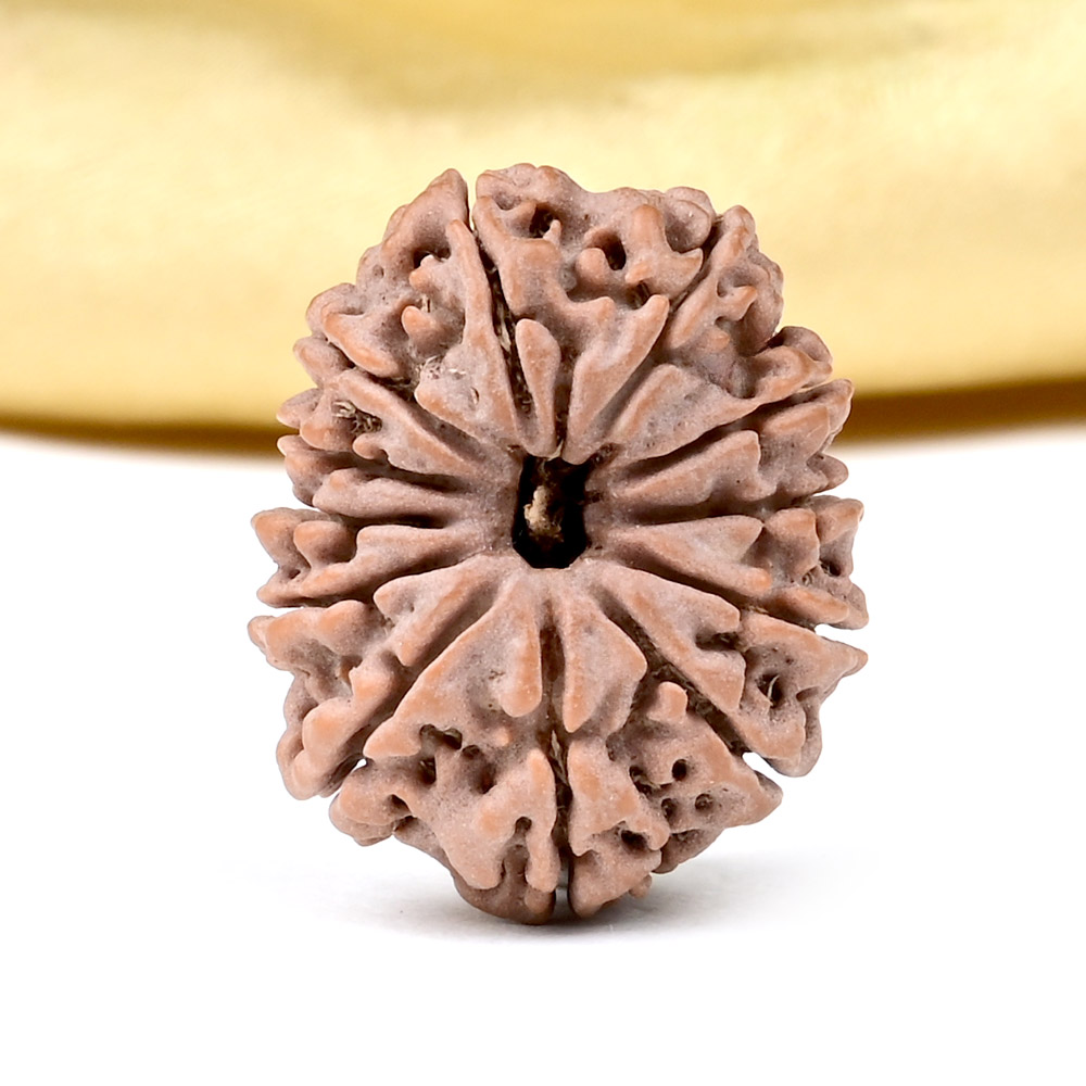 The 12 Mukhi Rudraksha embodies the energy of the Surya Deva and empowers the wearer with qualities of the Sun like authority, brilliance, and influence. It provides relief from stress and anger rooted in feelings of victimization, worries, suspicion, fear of the future, dependency, and low self-respect. The wearer gains personal power, drive, vigor, excellent health, and a commanding presence. This Rudraksha fosters leadership qualities, visionary abilities, and the motivation to take decisive action leading in achievements that bring name, fame, success, and recognition. Additionally, it supports overall health and aids in better digestion.