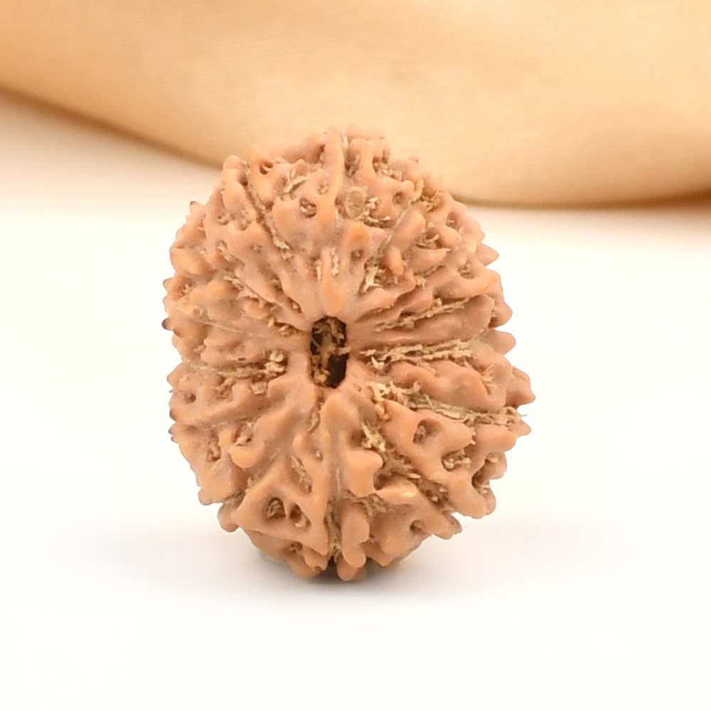 The 14 Mukhi Rudraksha is known as Deva Mani, the most precious divine gem. It embodies the mighty Hanuman and imparts the wearer with unwavering determination, divine insight, and the bravery to conquer any challenge. The wearer traverses the path of righteousness, achieving excellence, victory, and success. Hanuman, also known as Rudravtar, is a devoted disciple of Bhagwan Rama and imbues worshippers with His qualities of sincere devotion and unwavering loyalty towards dharma. Those attuned with this Rudraksha, and thus Lord Hanuman, are guided towards perfect mastery of the senses and virtues such as endurance, fearlessness, and courage. Wearing this Rudraksha helps alleviate uncontrolled anger and fear, bone pains, and blood-related disorders.