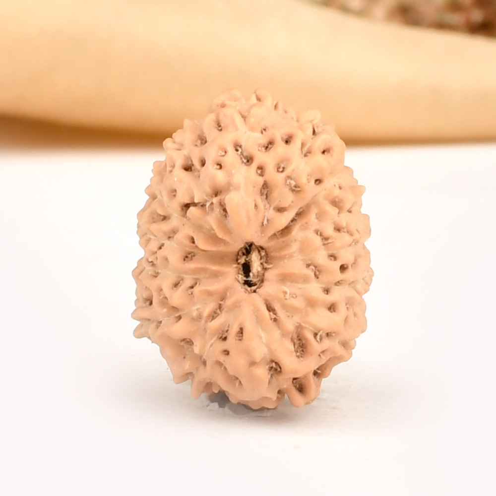 The 14 Mukhi Rudraksha is known as Deva Mani, the most precious divine gem. It embodies the mighty Hanuman and imparts the wearer with unwavering determination, divine insight, and the bravery to conquer any challenge. The wearer traverses the path of righteousness, achieving excellence, victory, and success. Hanuman, also known as Rudravtar, is a devoted disciple of Bhagwan Rama and imbues worshippers with His qualities of sincere devotion and unwavering loyalty towards dharma. Those attuned with this Rudraksha, and thus Lord Hanuman, are guided towards perfect mastery of the senses and virtues such as endurance, fearlessness, and courage. Wearing this Rudraksha helps alleviate uncontrolled anger and fear, bone pains, and blood-related disorders.