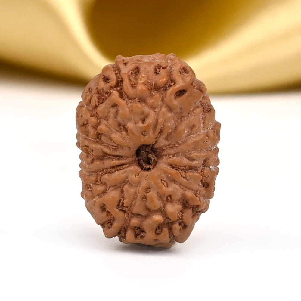 The 14 Mukhi Rudraksha is known as Deva Mani, the most precious divine gem. It embodies the mighty Hanuman and imparts the wearer with unwavering determination, divine insight, and the bravery to conquer any challenge. The wearer traverses the path of righteousness, achieving excellence, victory, and success. Hanuman, also known as Rudravtar, is a devoted disciple of Bhagwan Rama and imbues worshippers with His qualities of sincere devotion and unwavering loyalty towards dharma. Those attuned with this Rudraksha, and thus Lord Hanuman, are guided towards perfect mastery of the senses and virtues such as endurance, fearlessness, and courage. Wearing this Rudraksha helps alleviate uncontrolled anger and fear, bone pains, and blood-related disorders.