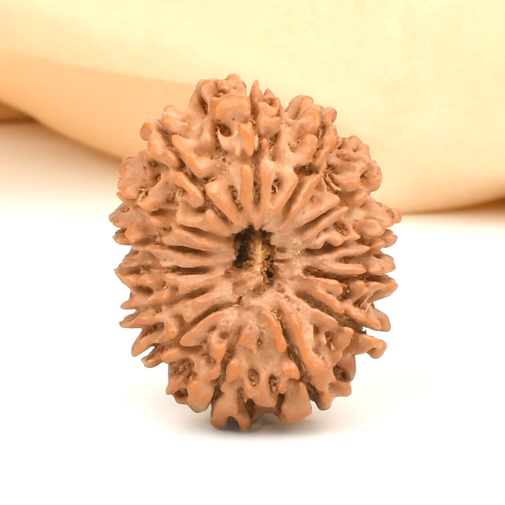 The 14 Mukhi Rudraksha is known as Deva Mani, the most precious divine gem. It embodies the mighty Hanuman and imparts the wearer with unwavering determination, divine insight, and the bravery to conquer any challenge. The wearer traverses the path of righteousness, achieving excellence, victory, and success. Hanuman, also known as Rudravtar, is a devoted disciple of Bhagwan Rama and imbues worshippers with His qualities of sincere devotion and unwavering loyalty towards dharma. Those attuned with this Rudraksha, and thus Lord Hanuman, are guided towards perfect mastery of the senses and virtues such as endurance, fearlessness, and courage. Wearing this Rudraksha helps alleviate uncontrolled anger and fear, bone pains, and blood-related disorders.