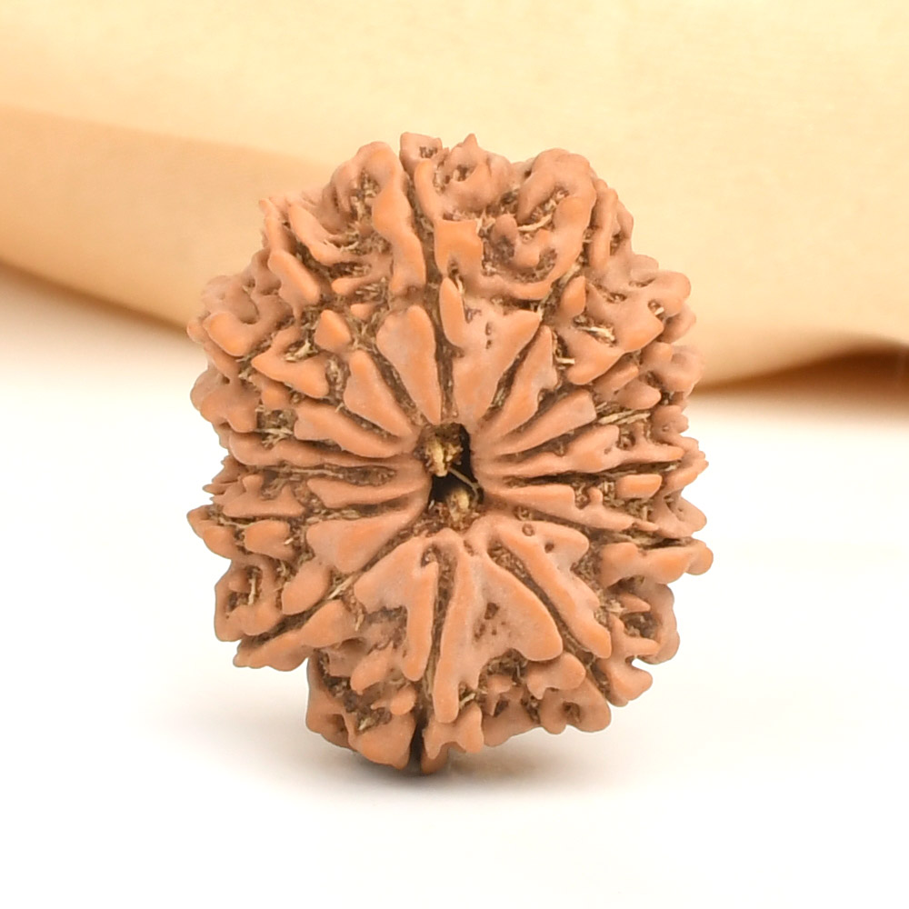 The 14 Mukhi Rudraksha is known as Deva Mani, the most precious divine gem. It embodies the mighty Hanuman and imparts the wearer with unwavering determination, divine insight, and the bravery to conquer any challenge. The wearer traverses the path of righteousness, achieving excellence, victory, and success. Hanuman, also known as Rudravtar, is a devoted disciple of Bhagwan Rama and imbues worshippers with His qualities of sincere devotion and unwavering loyalty towards dharma. Those attuned with this Rudraksha, and thus Lord Hanuman, are guided towards perfect mastery of the senses and virtues such as endurance, fearlessness, and courage. Wearing this Rudraksha helps alleviate uncontrolled anger and fear, bone pains, and blood-related disorders.