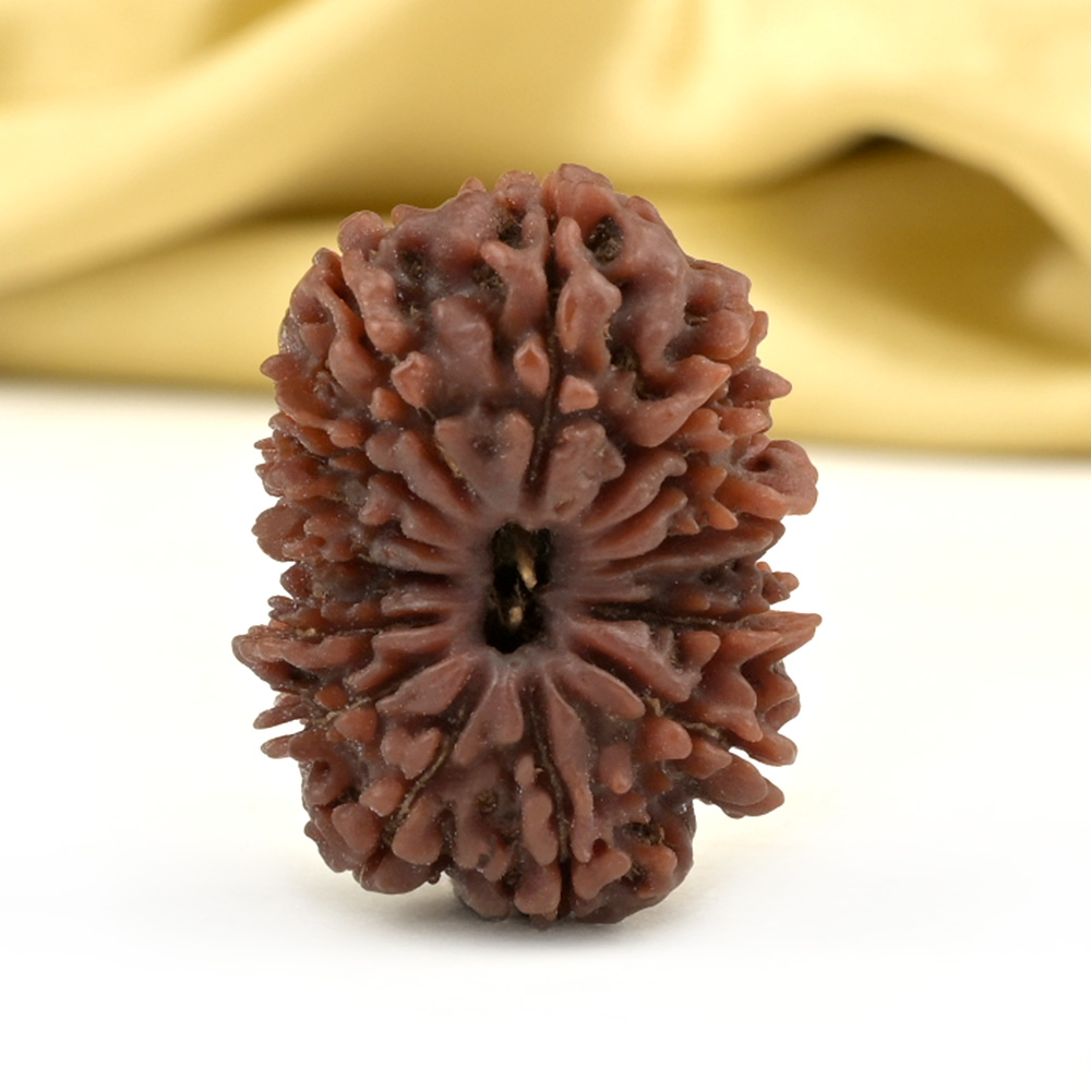 The 14 Mukhi Rudraksha is known as Deva Mani, the most precious divine gem. It embodies the mighty Hanuman and imparts the wearer with unwavering determination, divine insight, and the bravery to conquer any challenge. The wearer traverses the path of righteousness, achieving excellence, victory, and success. Hanuman, also known as Rudravtar, is a devoted disciple of Bhagwan Rama and imbues worshippers with His qualities of sincere devotion and unwavering loyalty towards dharma. Those attuned with this Rudraksha, and thus Lord Hanuman, are guided towards perfect mastery of the senses and virtues such as endurance, fearlessness, and courage. Wearing this Rudraksha helps alleviate uncontrolled anger and fear, bone pains, and blood-related disorders.