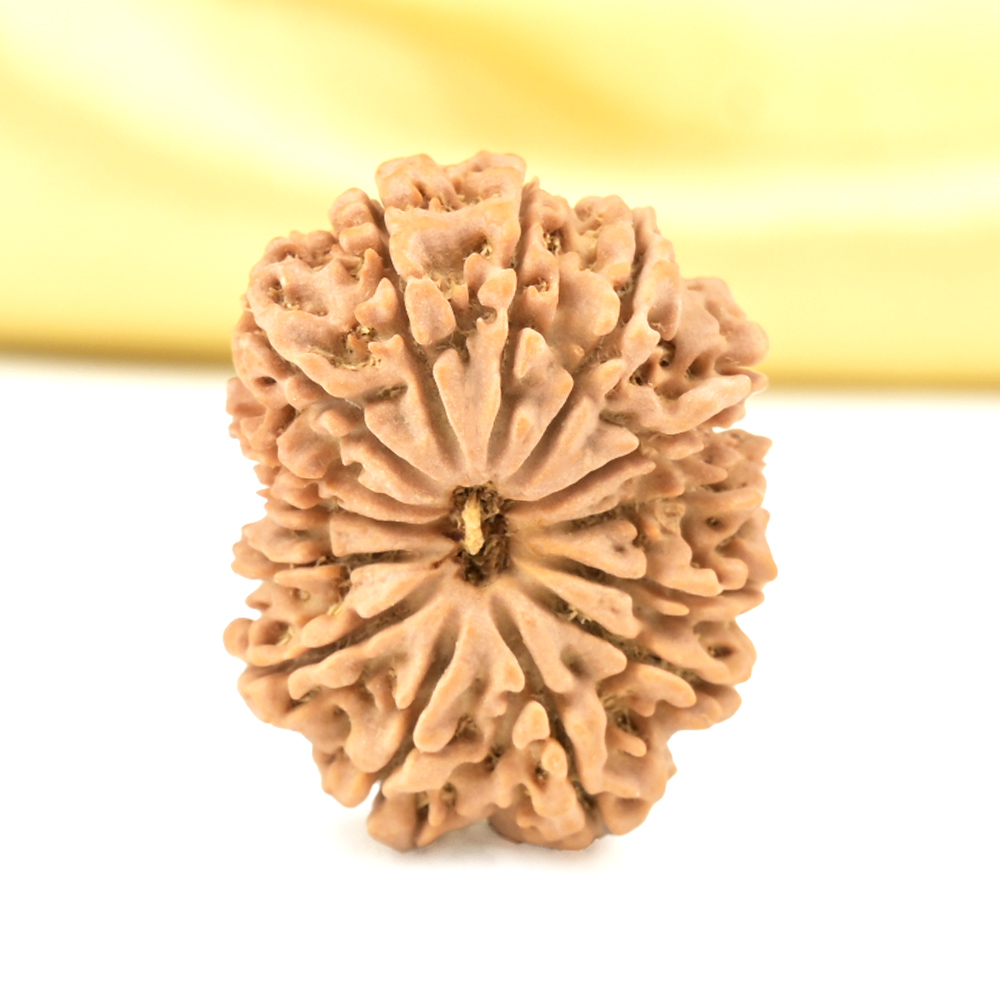 The 14 Mukhi Rudraksha is known as Deva Mani, the most precious divine gem. It embodies the mighty Hanuman and imparts the wearer with unwavering determination, divine insight, and the bravery to conquer any challenge. The wearer traverses the path of righteousness, achieving excellence, victory, and success. Hanuman, also known as Rudravtar, is a devoted disciple of Bhagwan Rama and imbues worshippers with His qualities of sincere devotion and unwavering loyalty towards dharma. Those attuned with this Rudraksha, and thus Lord Hanuman, are guided towards perfect mastery of the senses and virtues such as endurance, fearlessness, and courage. Wearing this Rudraksha helps alleviate uncontrolled anger and fear, bone pains, and blood-related disorders.