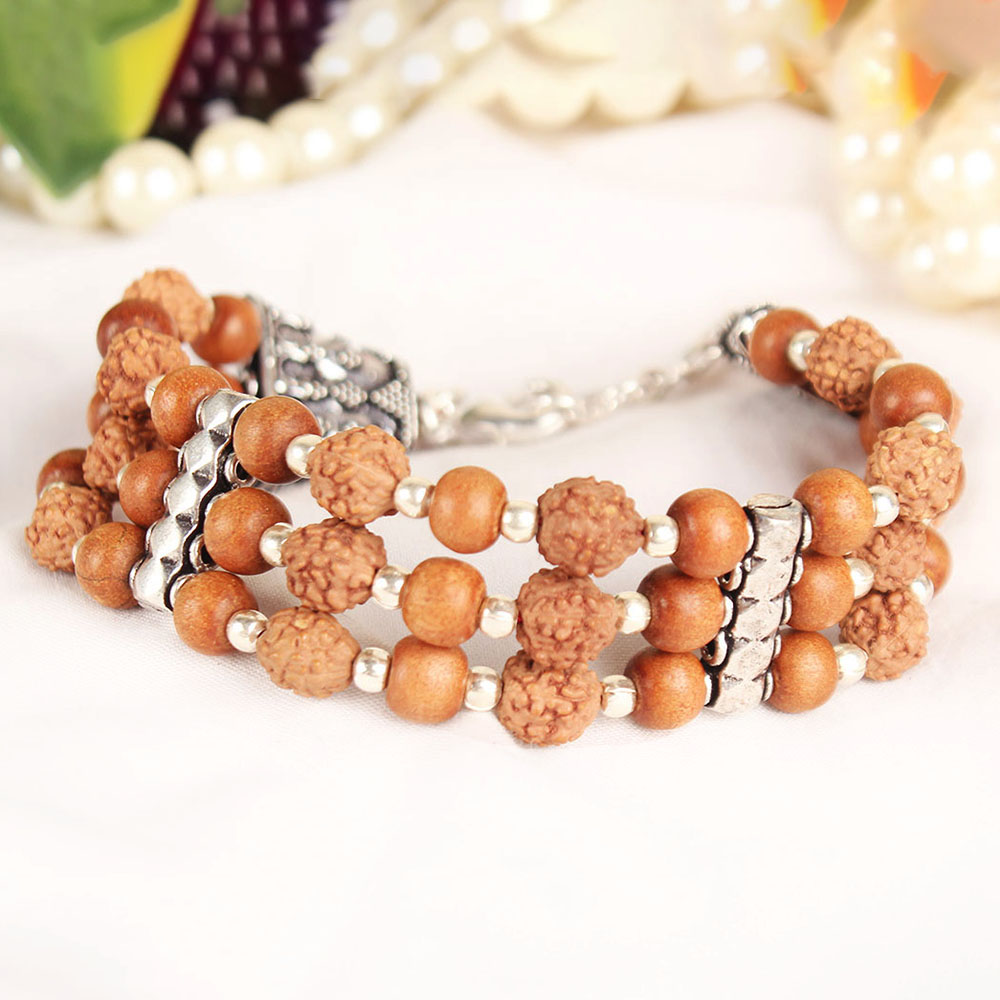 This soothing 4 Mukhi Rudraksha bead strung in triple turn design and thread with sandalwood beads provides calmness to the mind. The uniform 4 mukhi Java beads are approx. 8 mm in size. The bracelet strung with German silver spacers and balls is a great ornamentation for the wrists.