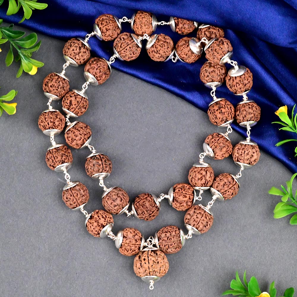 This exquisite 5 Mukhi Rudraksha Mala is crafted using hand-selected, premium-quality 5 Mukhi Rudraksha beads from Nepal. Each bead is elegantly encased in 925 sterling silver plain caps, secured with silver wire knots between the beads, and finished with a central Sumeru bead. The beads are strung in a clockwise orientation as per RRCT guidelines to ensure the best results.