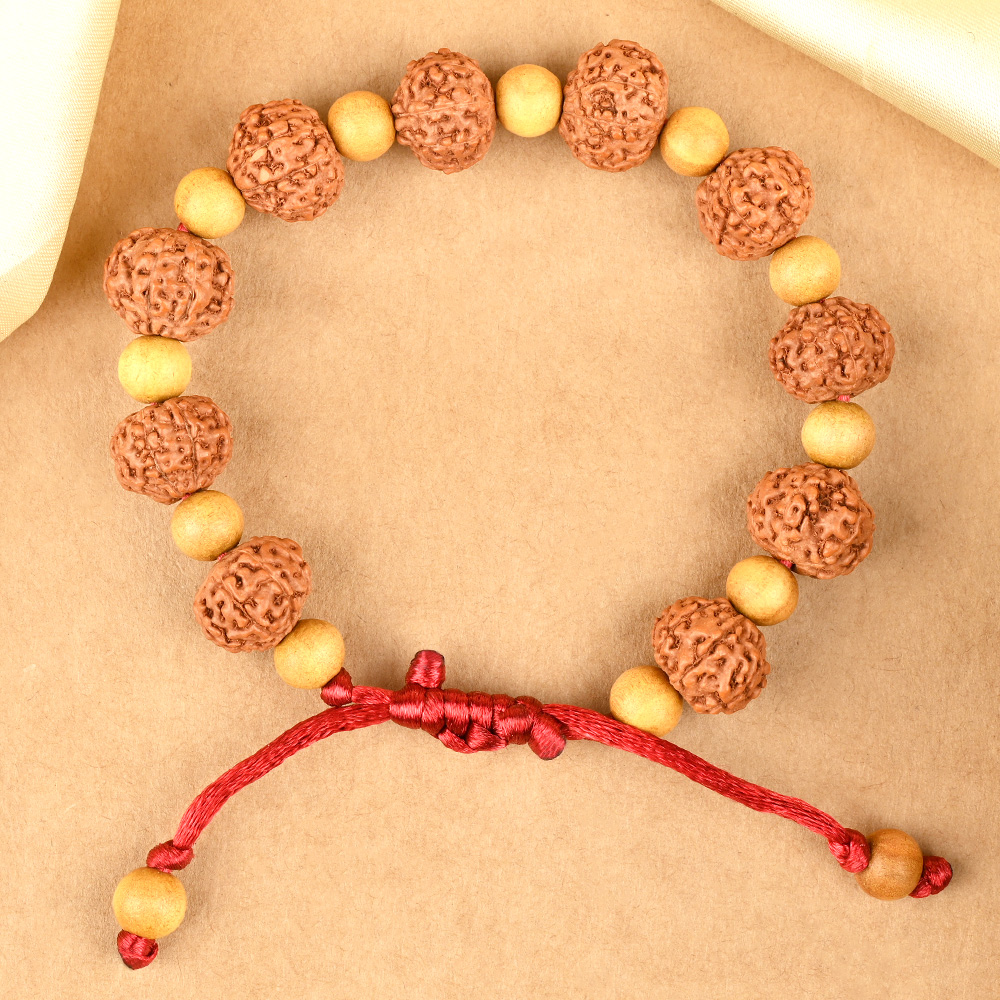 This sacred adjustable bracelet is crafted with authentic Eight Mukhi Rudraksha beads paired with smooth White Sandalwood beads, forming a calm and balanced design. The adjustable closure ensures a comfortable fit, while secure assembly supports regular spiritual wear.
