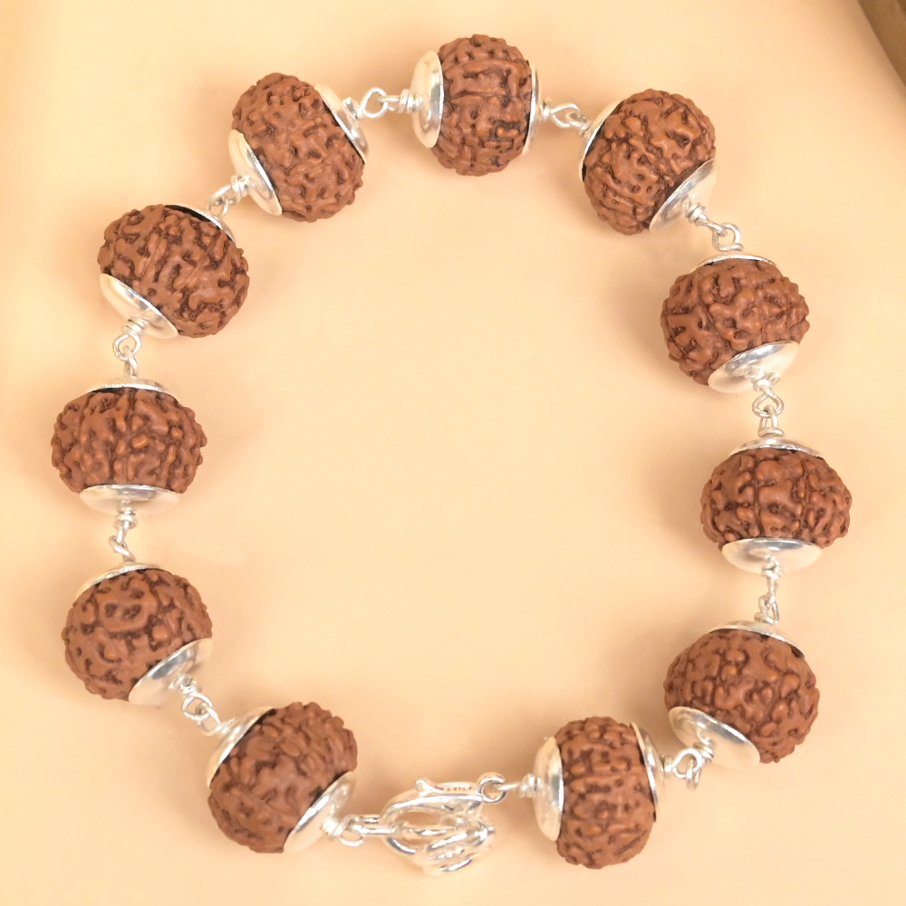 This 9 Mukhi Rudraksha Silver Plain Caps Bracelet features natural 9 Mukhi Rudraksha beads elegantly set with smooth, minimal silver plain caps that highlight the bead’s natural texture while adding a clean and timeless finish. The silver links and clasp ensure durability and comfortable wear, making this bracelet ideal for daily use as well as spiritual practices.