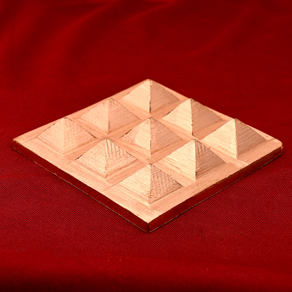 9 Pyramid Copper Plate is made in copper and is used to attract good luck, positivity and prosperity. The 9 Pyramid Copper Plate can be hung and can also be concealed in walls as per recommendation of the Vastu expert. Vastu experts also recommend the 9 Pyramid Copper Plate to rectify defects of the South, South East and South West direction. It is also kept in the cash box to increase the cash flow. The 9 Pyramid Copper Plate also acts as a protective tool to shield one from negative energies and evil eyes.