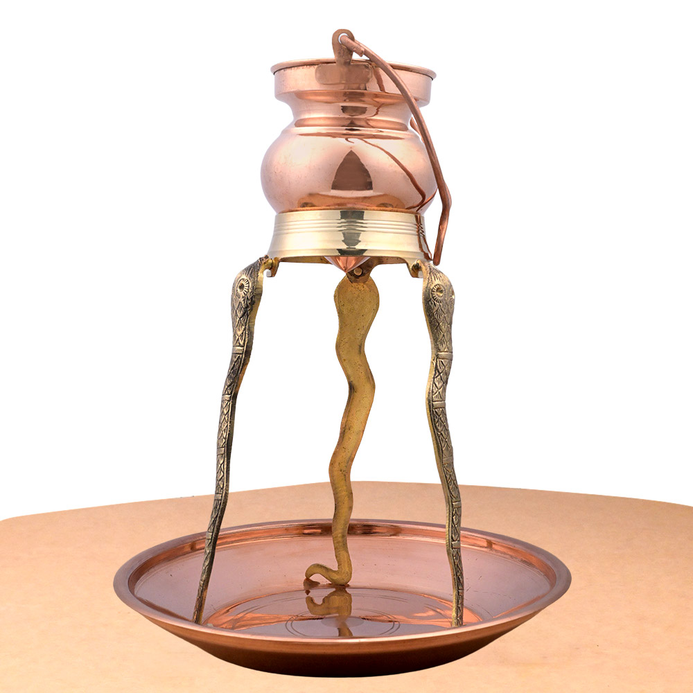 Copper Abhishek Pot with stand and plate is an ideal set for abhishekam. In Abhishekam, Lord Shiva is exalted in the form of linga or Lingam and abhishek is being performed with a variety of objects like curd, sugarcane juice, milk, coconut water, honey, belpatra etc.