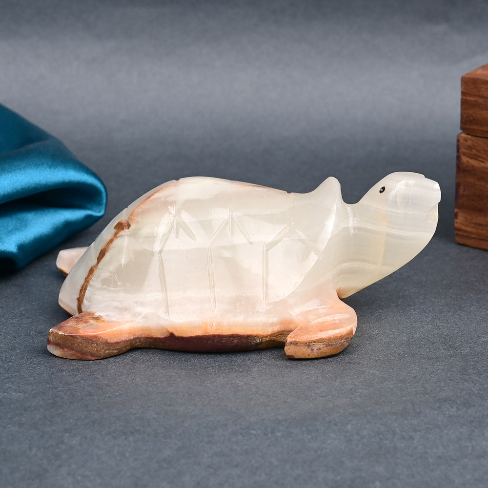 This Kurma (tortoise avatar of Lord Vishnu) made in natural white agate gemstone to promote harmony and a sense of security in home/office. Kurma, a manifestation of Lord Vishnu symbolizes grounding, steadiness, support, stability and longevity. Worshipping the Kurma form helps pacify the malefic of planet Saturn. Made in white Agate, it resonates calming energies to dispel stress, anxiety and frustration and brings mental balance and stability. It promotes positivity and strength to tackle the hard situation and brings fortune and success in business.