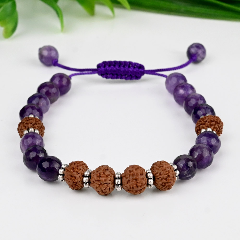 The Amethyst Faceted Beads & 9 Mukhi Rudraksha Bracelet with Adjustable Thread is a thoughtfully crafted design combining smooth, round amethyst beads in a rich purple hue with natural 9 Mukhi rudraksha beads. The bracelet features four 9 Mukhi rudraksha beads at the center, separated by intricately detailed metal Chakri separators, enhancing their rustic charm. Additional pairs of rudraksha beads are positioned on either side, also accented with silver chakri separators, creating a harmonious blend of textures. The polished amethyst beads are evenly strung, adding a touch of elegance and balance to the bracelet. Designed with adjustable thread strings, it ensures a comfortable and secure fit, making it a perfect accessory for both style and spiritual connection. Benefits: Amethyst supports the crown chakra, promoting spiritual growth, inner peace, and clarity. 9 Mukhi rudraksha activates the root chakra, encouraging grounding, courage, and stability, while connecting to the protective energy of Goddess Durga. Metal chakri separators amplify positive vibrations and symbolize balance and harmony. Aligns and harmonizes chakras, enhancing meditation and spiritual practices. Encourages emotional balance, reduces stress, and fosters resilience against negativity.