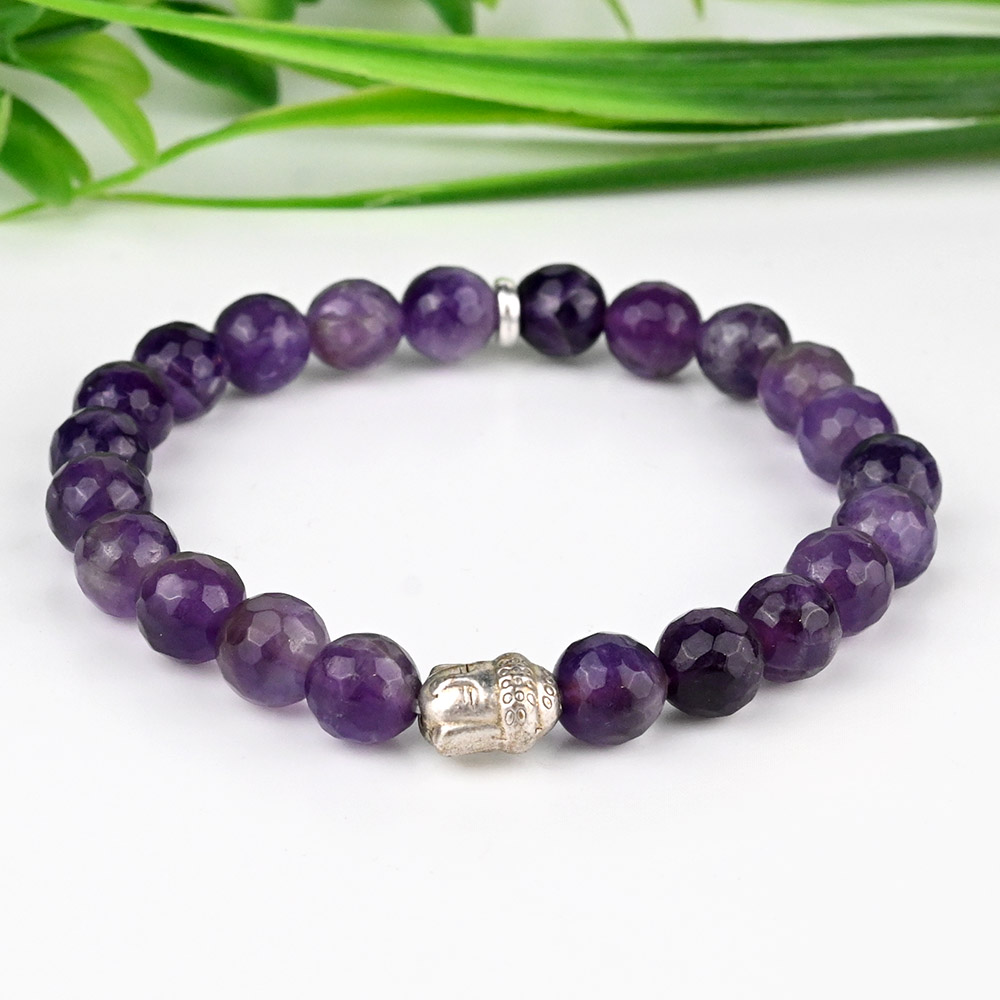 This bracelet features faceted Amethyst beads in a rich purple hue, meticulously cut to reflect light and showcase their natural brilliance. The design is accentuated with a German silver Buddha charm, symbolizing wisdom, peace, and spiritual enlightenment. The faceted beads are strung on a stretchable cord for a comfortable and snug fit, making it easy to wear throughout the day. The serene combination of the calming Amethyst beads and the spiritual Buddha charm makes this bracelet a meaningful accessory for daily wear or meditation practices. Benefits: Promotes emotional balance and fosters a sense of peace and calmness. Enhances spiritual awareness and aids in deep meditation. Protects against negative energy and cultivates positive vibrations. Encourages clarity of thought, mindfulness, and inner strength.