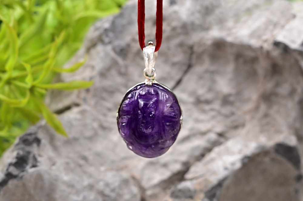 Exquisitely crafted, the lovely Ganesh locket showcases a round, natural Amethyst stone, elegantly encased in a silver cap. It is delicately threaded on a silk cord, boasting powerful healing properties. It is a stone of spirituality and contentment. It can absorb negativity and radiate positivity. It enhances psychic awareness, making it a stone of wisdom. Amethyst enhances intuition, inspires creativity, and promotes peace and stability.