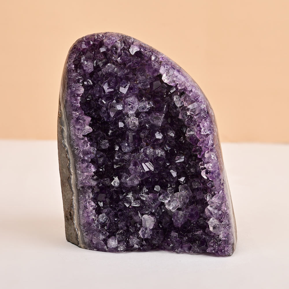 Amethyst is valued for its soothing and healing qualities. It also promotes relaxation and balance. By displaying this geode, you can create a peaceful atmosphere in your space. In addition to its calming effects, amethyst helps with stress relief, inner strength, and spiritual growth. It also improves clarity of thought, emotional stability, and promotes better sleep.