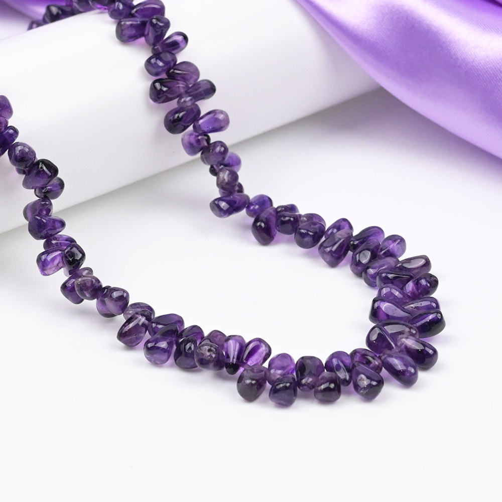 This Amethyst Pear Shape Beads Necklace features beautifully cut pear-shaped amethyst beads, arranged in an elegant, flowing design. The necklace is designed for sturdiness, with each bead securely strung, and is finished with a lobster clasp to ensure a secure fit.