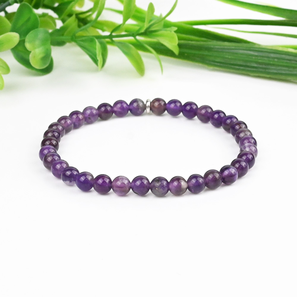 This bracelet features smooth, polished amethyst beads elegantly strung on a durable elastic cord. Its stretchable design ensures a comfortable fit, making it easy to wear and perfect for any occasion. Benefits: Removes negativity and fosters optimism. Enhances spiritual consciousness and awareness. Brings clarity of thoughts and emotional balance.