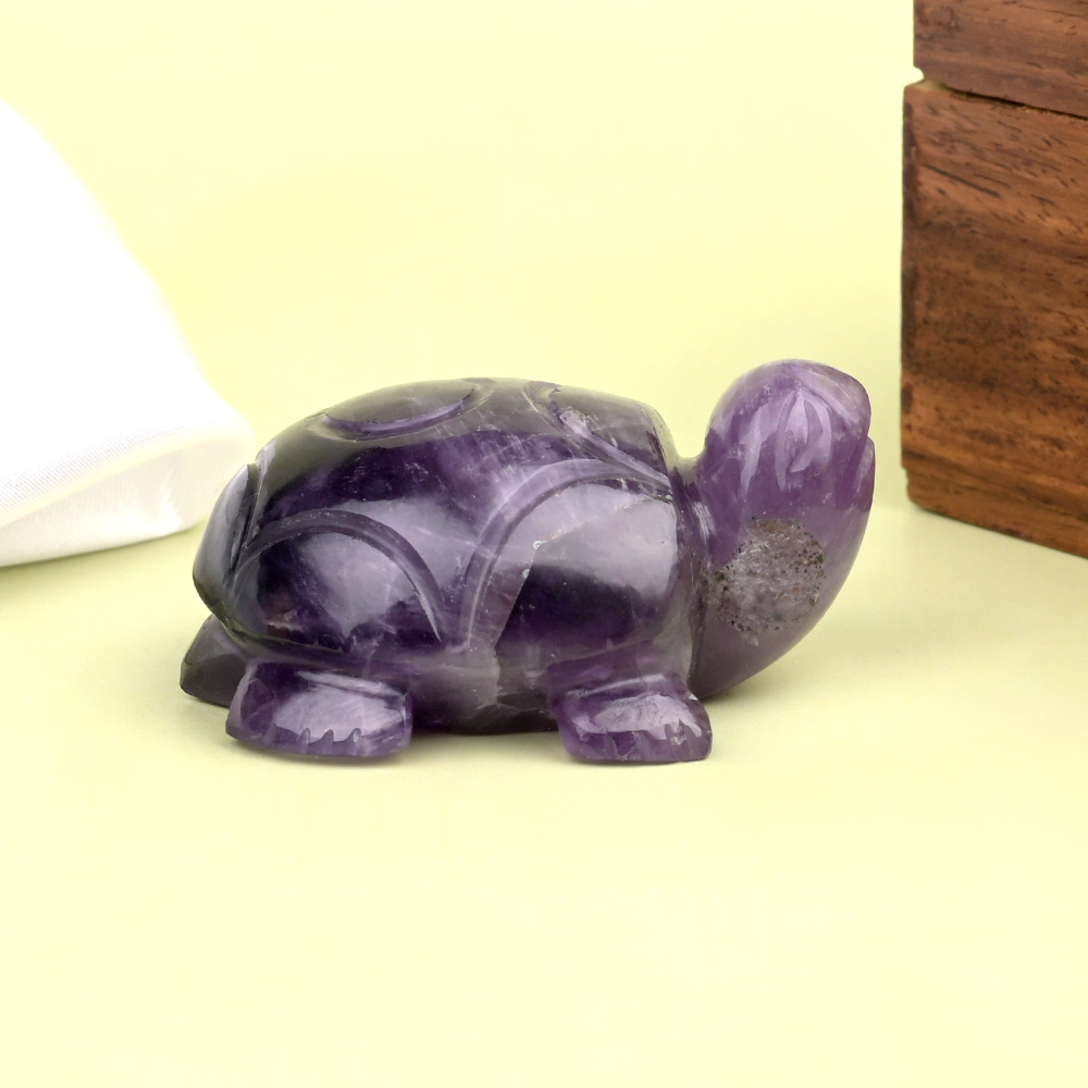 Kurma(tortoise), an avatar of Lord Vishnu representing stability and support is carved in Amethyst (stone of spirituality and contentment). It helps cleanse the aura and fills it with positive energies and brings luck and fortune. Placing the Kurma facing the West direction offers longevity, stability in all aspects of life, positivity, and abundance.