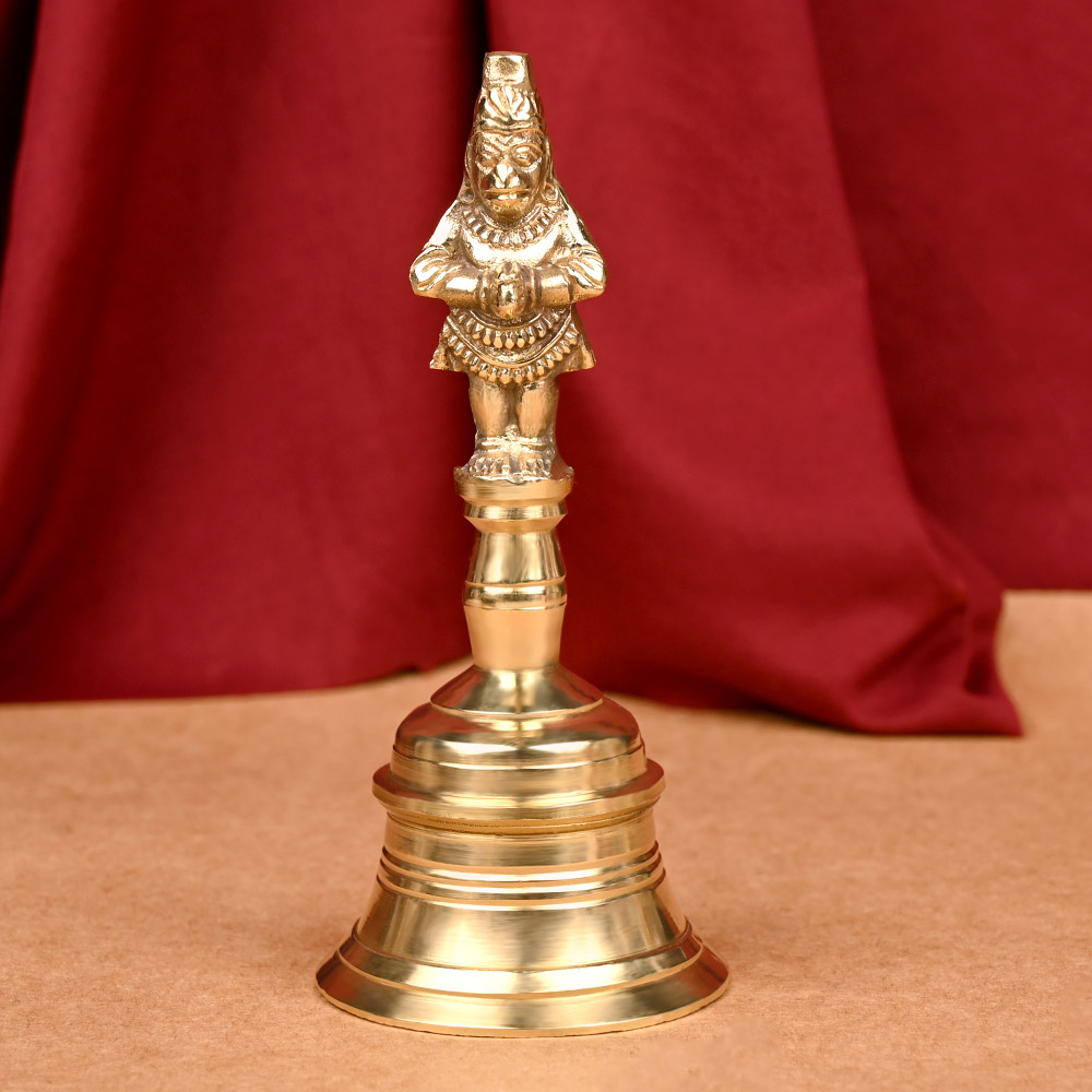 A heavy bell with Lord Hanuman with folding hands on the handle, made in high quality finish in shining brass.