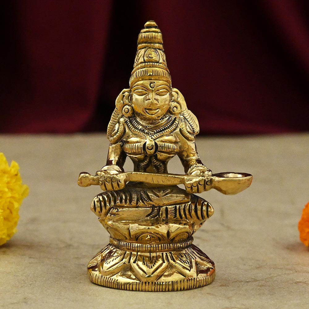 This brass murti of Maa Annapurna Devi depicts the goddess of nourishment holding a jeweled pot and spoon, embodying generosity and abundance. As a form of Parvati, Annapurna brings infinite prosperity, fulfillment, and spiritual enrichment to your home, promoting harmony and gratitude.