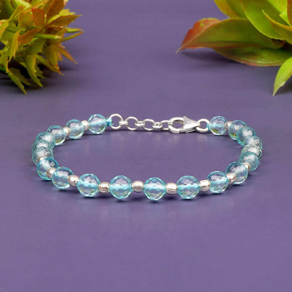 This graceful bracelet features faceted Aquamarine beads in a soft ocean-blue hue, accented with 925 sterling silver balls that enhance its elegance and energetic flow. Finished with a sturdy lobster clasp, it offers a secure and refined fit, perfect for everyday wear or spiritual enhancement. Made with natural Aquamarine and pure silver, this bracelet blends clarity, calmness, and purity in both look and effect. Benefits Promotes emotional balance, mental clarity, and peaceful communication. Boosts intuition, soothes anxiety, and aligns the wearer with inner truth.