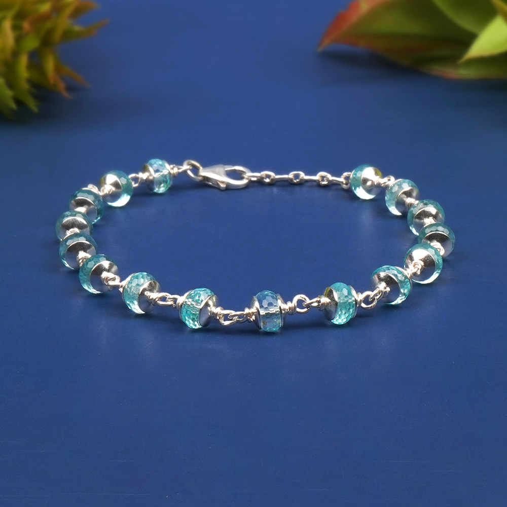 This exquisite bracelet features faceted elliptical Aquamarine beads, each secured with sleek 925 silver plain caps that add a polished finish to the ocean-hued shimmer. Linked with sterling silver wire and a lobster clasp, it offers both elegance and a reliable, adjustable fit for everyday or spiritual wear. Made from natural Aquamarine and pure silver, this piece blends clarity, calmness, and minimalist charm. Benefits Encourages emotional stability, peaceful communication, and gentle energy flow. Supports mental clarity, reduces stress, and nurtures a grounded, intuitive presence.