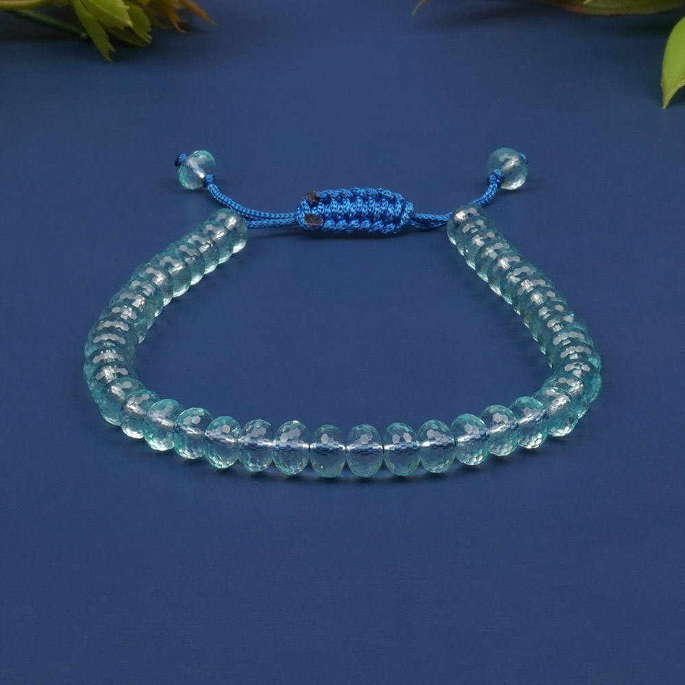 This unique bracelet features faceted elliptical Aquamarine beads with a soft aqua hue, offering a striking combination of brilliance and fluid design. Strung on a durable blue adjustable thread, it provides a comfortable fit for all wrist sizes and is finished with matching Aquamarine end beads for a refined look. Crafted from natural Aquamarine in an eye-catching elliptical cut, ideal for those seeking elegance with healing. Benefits Brings clarity of thought, emotional calm, and graceful self-expression. Encourages deep relaxation, enhances intuition, and supports energetic balance.