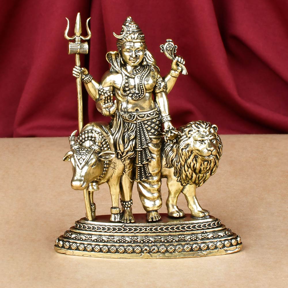 This divine idol portrays Ardhanarishwar, the sacred union of Lord Shiva and Goddess Parvati in a single form—half male and half female—symbolizing the balance of masculine and feminine energies in the universe. One side of the figure features Lord Shiva holding a Trishul, adorned with rudraksha malas, snake ornaments, and accompanied by Nandi the bull, while the other half represents Goddess Parvati, holding a lotus and accompanied by a lion, her vahana. The figure stands on a beautifully carved pedestal with intricate floral and geometric patterns enhancing its grandeur.