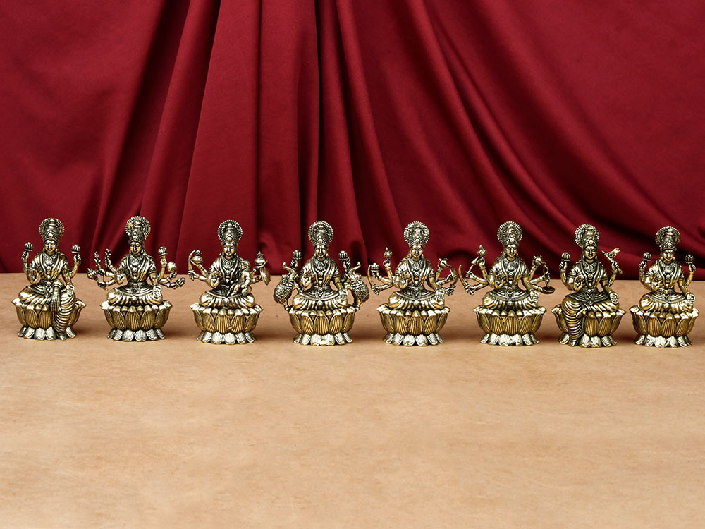 This elegant Ashtadhatu idol set represents the Ashta Lakshmi—the eight divine forms of Goddess Lakshmi, each governing a unique aspect of wealth and prosperity in life. Seated gracefully on lotus pedestals, each form is richly detailed with their respective divine symbols and attributes.